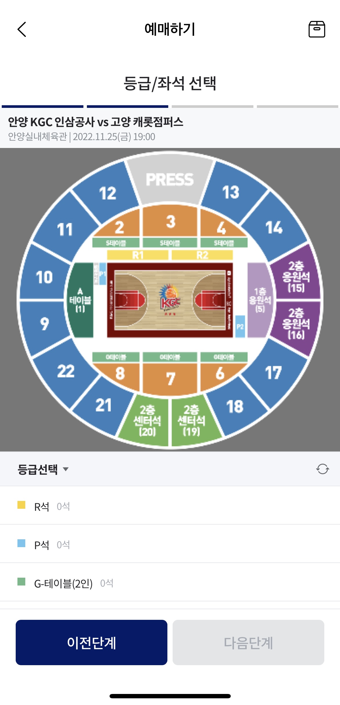 예매하기를 누르면 좌석을 선택할 수 있는 화면이 나옵니다. 근데 각 좌석의 위치만 나오지 가격이 나오지 않아서 불편하였습니다. 왜 이렇게 앱을 만든 것인지 모르겠습니다. 그래서 제가 안양 KGC 홈페이지에서 가격을 가져왔습니다. 참고하시면 될 것 같습니다.