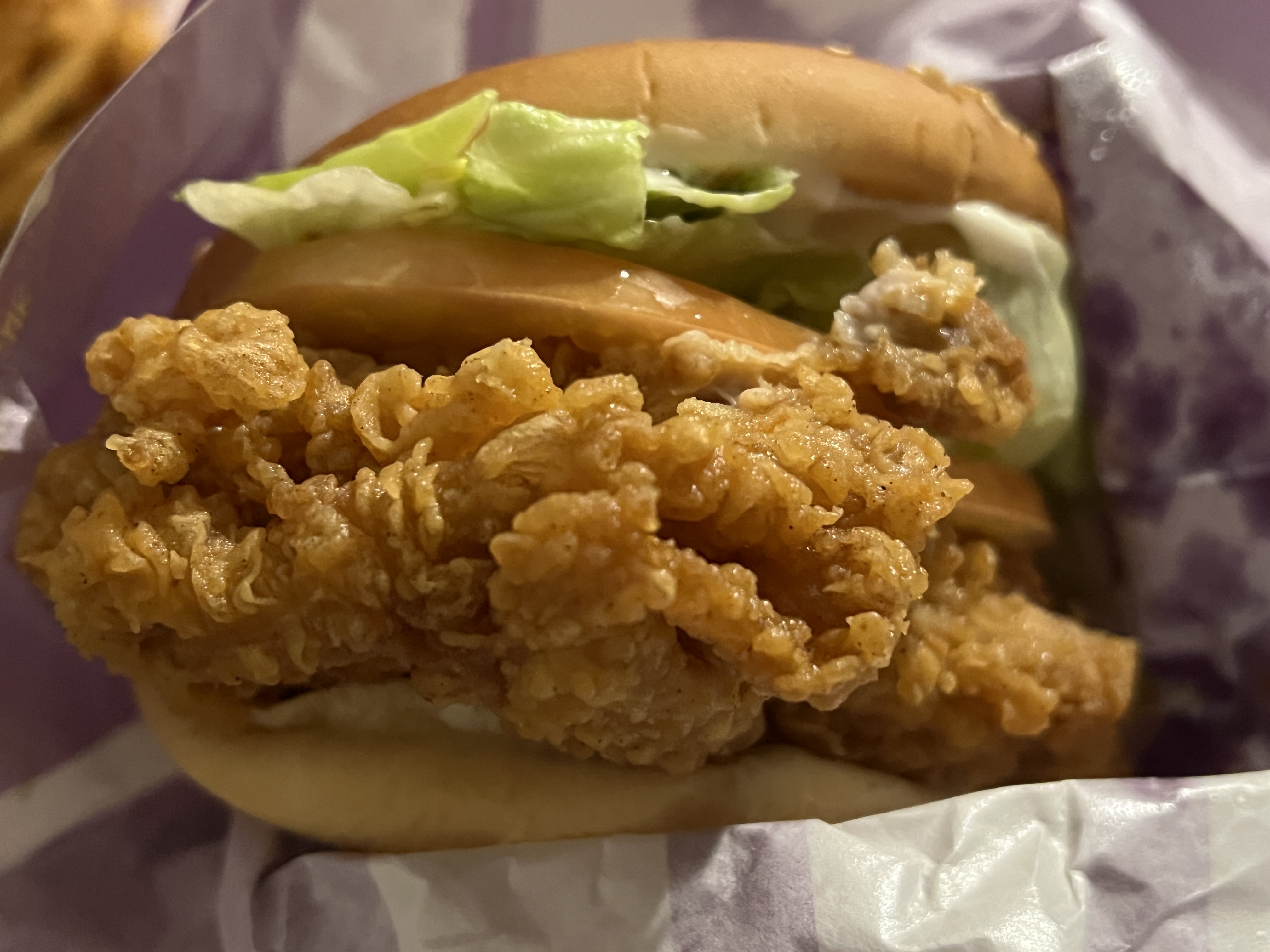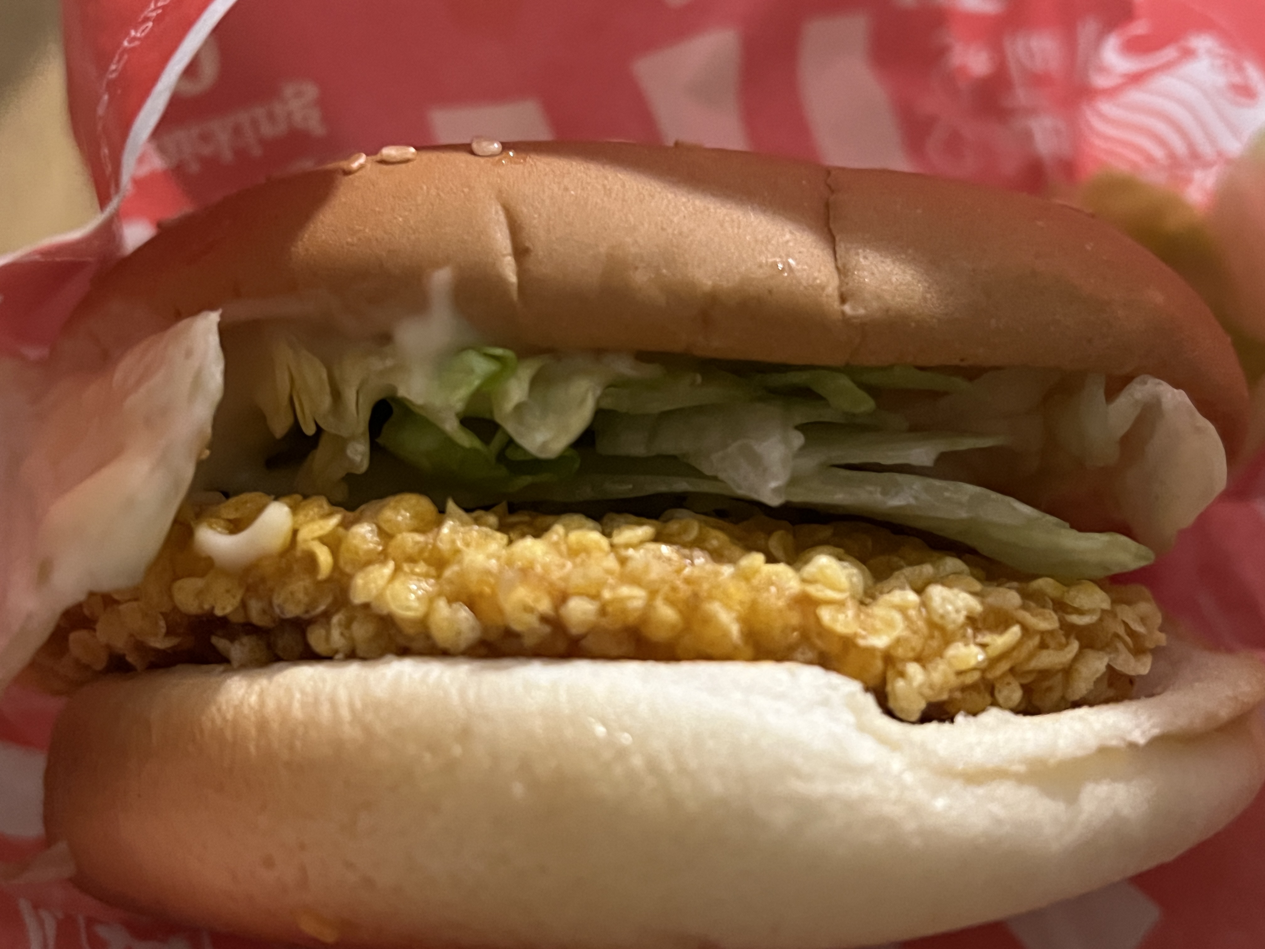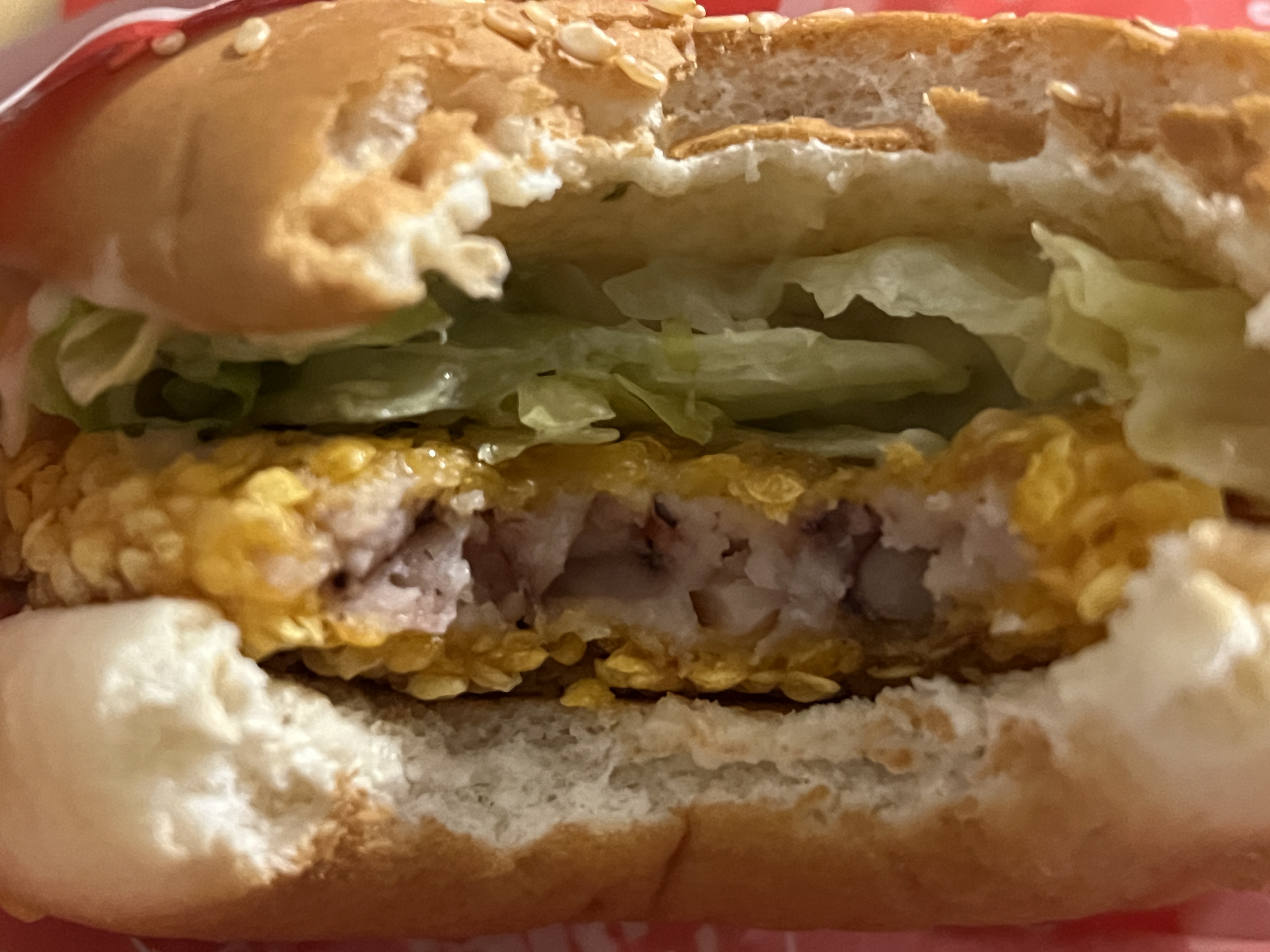 한입 먹었더니 말린 오징어의 풍미가 입안에 감돕니다. KFC에서 의도한 것인지는 알 수 없으나 야채도 양이 적어서 패티의 옥수수와 마른오징어를 잘 느낄 수 있었습니다. KFC에 애정이 있어서 좋게 해석한 것은 아님을... 알려드리고 싶으나 저의 속마음을 저도 모르겠습니다 ㅎㅎ