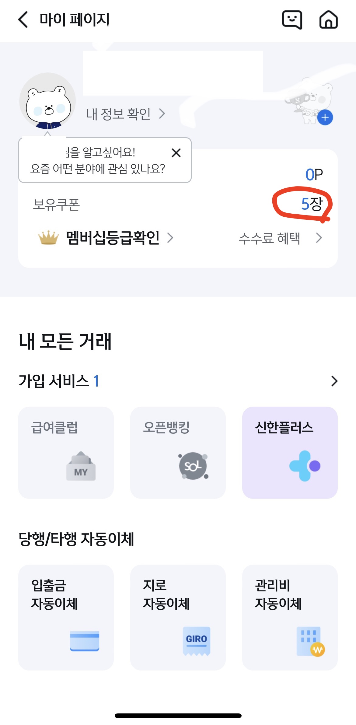 마이페이지 화면에서 보유쿠폰을 확인하실 수 있습니다. 파란색 숫자를 눌러줍니다.