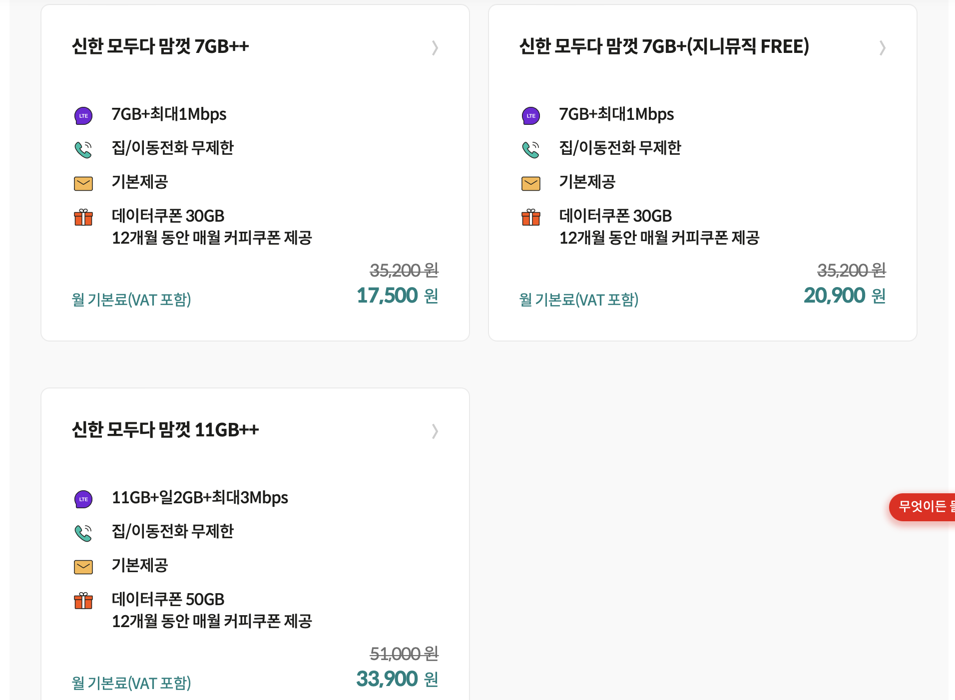 제가 가입한 요금제는 통화와 문자 무제한, 매월 7GB+최대1Mbps로 데이터 또한 무제한으로 이용 가능하고 데이트 30gb 쿠폰에 매월 메가 커피 따뜻한 아메리카노 쿠폰을 주는 혜택이 있어서 변경하였습니다.