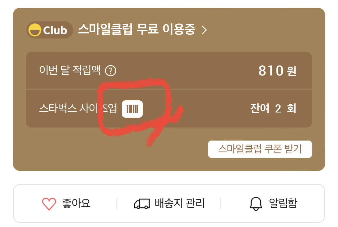 3. 스타벅스 사이즈업이란 글자 옆 바코드 그림을 터치하여 바코드를 직원에게 보여줍니다.