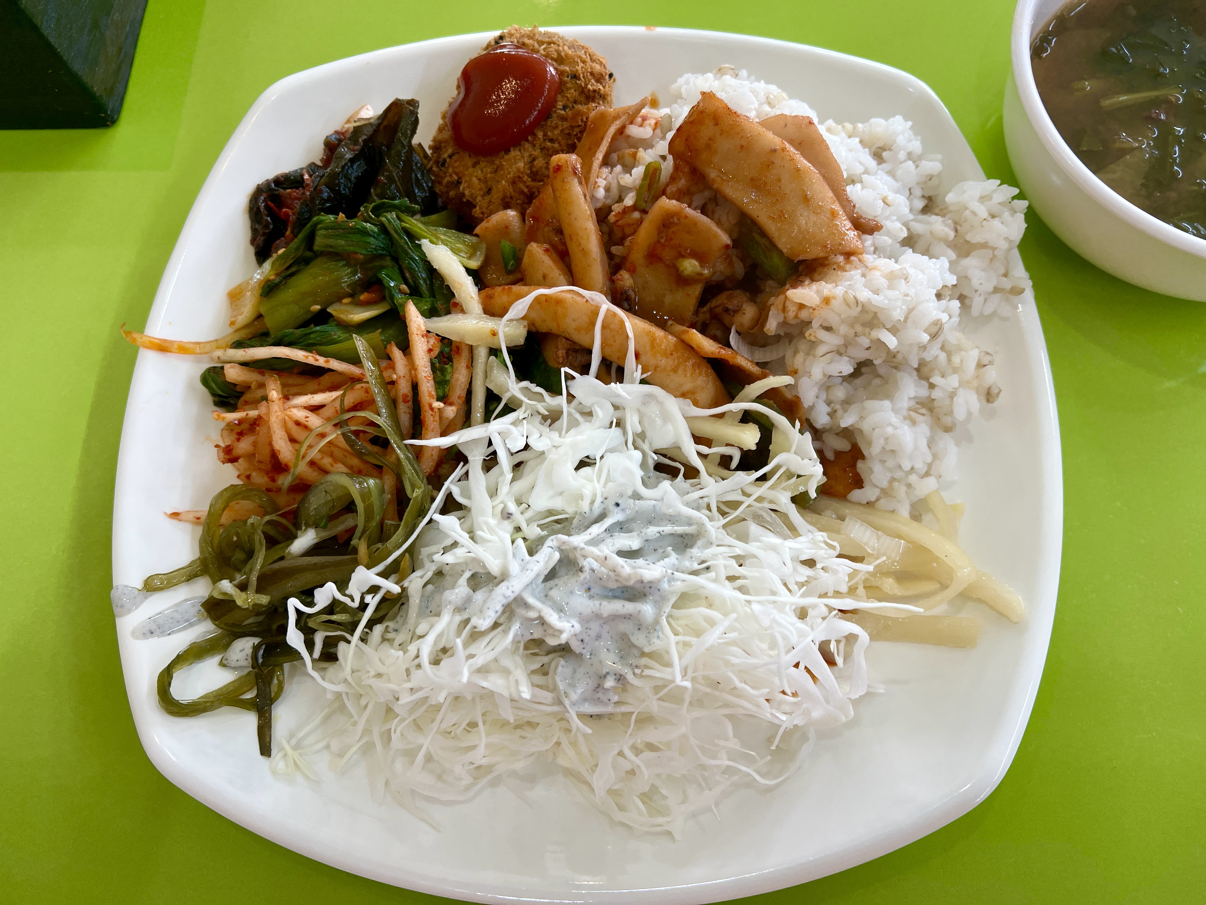 국을 제외하고 8개정도 반찬이 있었습니다. 오징어볶음, 도라지 무침, 양배추 샐러드, 미역줄기 무침, 무생채, 나물무침, 김치, 크로켓이 있습니다.